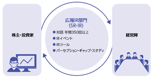 IR部門では、株式市場と年間350回以上の対話を重ねています。経営方針や事業戦略などの理解を促すとともに、市場の意見を集約し、経営陣にフィードバックすることで、企業経営に活用しています。また、投資家向けイベントやツールを充実させ、SR・IR活動を強化しています。