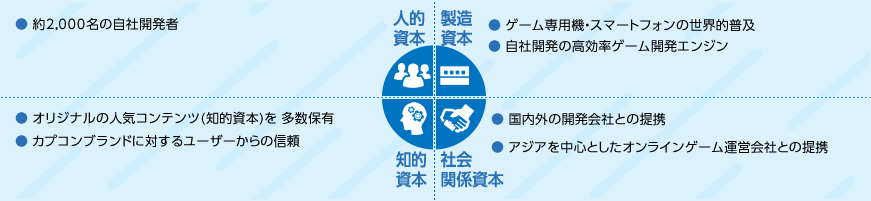 コンシューマ機向けパッケージソフトとダウンロードコンテンツ(DLC)の開発・販売、モバイルコンテンツおよびPCオンラインゲームの開発・運営を行っています。コンシューマゲームでは、アクションやアドベンチャーを中心に独創的なオリジナルコンテンツを生み出し、これら多くのミリオンタイトルをスマートフォン・タブレット型端末やPCオンラインで活用し、全世界に配信することで収益の最大化を図っています。