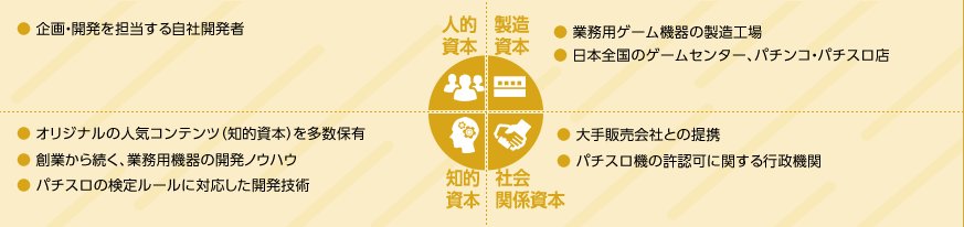 パチンコ&パチスロ(PS)事業では、遊技機向け筐体および液晶表示基板、ソフトウェアを開発・製造・販売。業務用機器販売事業では、アミューズメント施設向けに業務用ゲーム機器を開発・製造・販売し、事業間シナジーを創出しています。