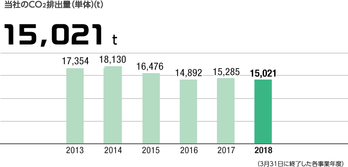 当社は、全事業所の継続的な節電実施や、アミューズメント施設における省エネへの取り組み、パソコン等の電気機器の電力消費のピークシフト対応等により電力消費の削減に取り組んできました。2012年3月期から2014年3月期は、特にアミューズメント施設において、東日本大震災による営業時間短縮からの復旧のため、電力使用量は増加傾向にありましたが、2014年3月期以降は省エネゲーム機の導入やLED照明への切り替えを推進し、CO2の排出量を削減しています。また、2017年3月期は「研究開発第2ビル」および「カプコンテクニカルセンター」の新設により、CO2排出量は前期に比べて増加しました。しかしながら、各種省エネルギー設備を導入した結果、ビル全体のCO2排出量は従来設計に比べ、約10%減少※しています。