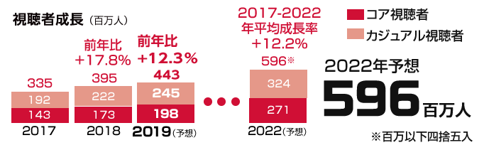 グローバルの視聴者数は、インターネットの普及を背景として、2017年の約3億人から2022年には約6億人へと5年にわたり毎年2桁の成長率を見込んでいます。視聴者数の約5割以上をカジュアル視聴者が占め、「ゲームを観戦して、楽しむ」というエンターテインメントが一般化していくと想定されます。