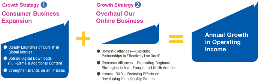 Capcom positions the Consumer business, our source of corporate value, as one of the most important businesses in our growth strategy. We will reduce performance volatility and realize our new medium-term business goal of annual growth in operating income through the implementation of the following three measures.