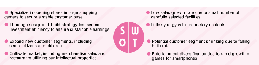 The domestic arcade facilities market grew during the previous fiscal year (ended March 31, 2016) for the first time in nine years to 433.8 billion yen (up 2.7% from the previous year). This was due to a slowing of the downturn in consumer spending following the consumption tax increase of April 2014. The total number of arcades decreased to 14,862 (down 4.8% from the previous year), but the number of units installed at each arcade increased to 33.6 (up 2.5 units from the previous year), and annual sales per facility increased to 29.19 million yen (up 7.9% from the previous year), demonstrating that the closing of unprofitable locations and streamlining of management by many companies has been successful. This fiscal year (ended March 31, 2017), the market showed a recovery with increased sales per customer due to restrictions on the time that minors can be in arcades while accompanied by a guardian being relaxed in the Entertainment and Amusement Trades Act (Entertainment and Amusement Trades Rationalizing Act).