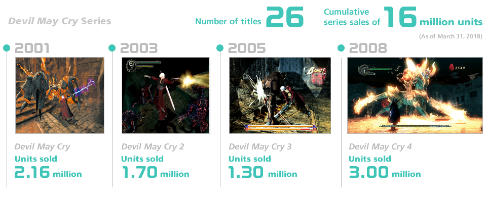 The hit Devil May Cry series features appealing characters brimming with individuality and stylish action where players seek to dispatch enemies in sleek and showy ways. Since the 2001 launch of the first title, this series created a buzz with its beautiful graphics and exhilarating action, becoming popular worldwide.