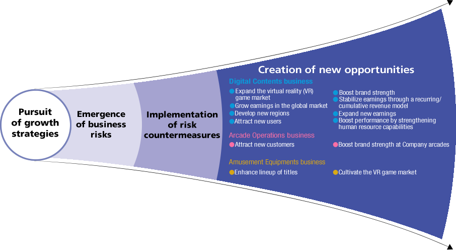 Capcom is driving its growth strategies forward in order to achieve our medium-term business goal of increased operating income every fiscal year. Pursuing our growth strategies, however, inevitably entails business risks. We implement measures for each expected risk, thereby mitigating or avoiding risks, and promote risk management that allows for generating new growth opportunities.