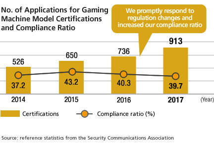 | Only models that obtain Security Communications Association certification can be sold | By joining the Japan Pachislo Machine Industry Association (Nichidenkyo), get an understanding of trends with regulatory agencies and build a framework for immediately responding to regulatory changes |