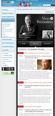 In addition, the website includes introductions to managerial profiles and philosophies called “Views & Personalities,” as well as game-style content, “Capcom Quiz” and “Trivial Pursuits” which is filled with Capcom trivia. Fun and unique content also led to the number-one ranking for Capcom’s investor relations website among all the sites of publicly owned companies in Japan.
