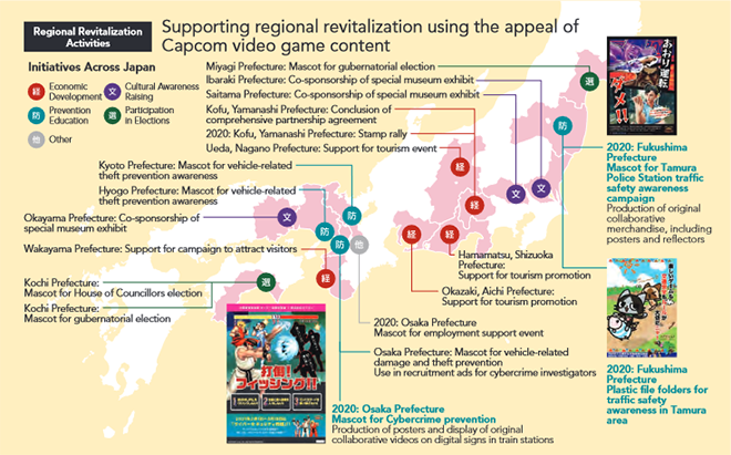 Capcom supports regional revitalization efforts throughout Japan by leveraging the power of its brands to engage people in four areas: Economic Development, Cultural Awareness, Prevention Education and Election Participation. The company has carried out various activities since 2009, such as concluding the first comprehensive agreement between a video game company and a local government body, collaborating with prefectural police in the Kansai region on prevention activities, and working to raise awareness of gubernatorial elections.