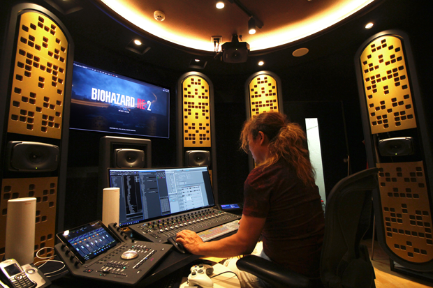- 音響ですね。2017年に導入した3D音響ブース「ダイナミックミキシングステージ」を活用し、『RE:2』では7.1.4chに対応したドルビーアトモスを採用しています。また、バイノーラル技術を駆使してリアルタイムでの音像変化に対応することで、キャラクターの位置に応じて、前後左右からゾンビ等のうめき声が聞こえるように表現しており、視覚だけでなく、聴覚も含めてより恐怖が感じられると思います。