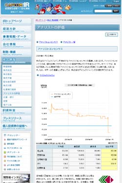 当社IRサイトでは、投資家の皆様およびユーザーの方々が直感的に理解でき、使いやすいサイトを目指して、市場情報や事業内容などを数値やグラフ、画像、解説を交えて纏めるとともに、開発者のインタビューや過去のヒット作品を動画で紹介するなど、当社の事業を十分にご理解いただけるよう配慮しております。また、アナリストのコンセンサスデータやレーティングなど第三者の評価も積極的に掲載するなど、事業と業績の情報を多角的に網羅いたしました。
