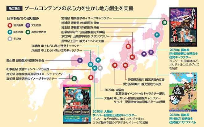 当社では、コンテンツが人を惹きつける力を活用し、経済振興、文化啓蒙、防犯啓発、選挙投票啓発の4分野から、全国各地域の活性化を支援しています。2009年以降、ゲーム会社と地方自治体とでは初の包括協定締結や、近畿における府県警察の防犯啓発施策への協力、知事選挙の投票啓発など、様々な取り組みを行ってきました。